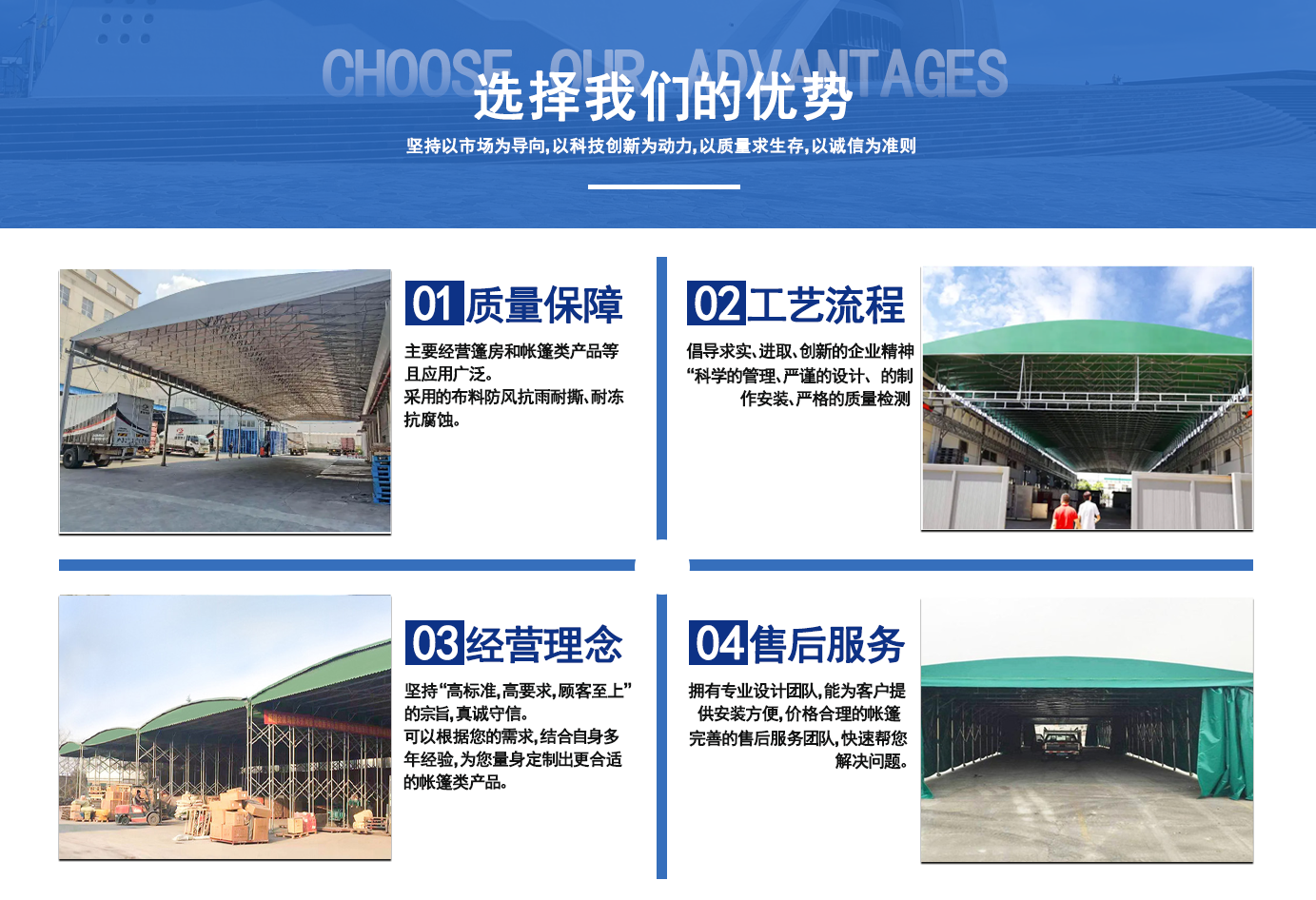 遼寧拓圖鋼結(jié)構(gòu)工程有限公司是一家專業(yè)從事推拉篷設(shè)計、制作、安裝、使用、維修的綜合性公司。公司主營:電動雨棚、活動雨棚、倉庫雨棚、體育類雨棚、篷房、篷布、帳篷等系列產(chǎn)品的制作與安裝。 遼寧拓圖鋼結(jié)構(gòu)工程有限公司堅持以市場為導(dǎo)向,以科技創(chuàng)新為動力,以質(zhì)量求生存,以誠信為準(zhǔn)則,倡導(dǎo)求實、進取、創(chuàng)新的企業(yè)精神。“科學(xué)的管理、嚴(yán)謹(jǐn)?shù)脑O(shè)計、 的制作安裝、嚴(yán)格的質(zhì)量檢測、良好的后期服務(wù)成就企業(yè)的信譽,為您提供優(yōu)質(zhì)服務(wù)。 遼寧拓圖鋼結(jié)構(gòu)工程有限公司傾力于開發(fā)應(yīng)用三維空間結(jié)構(gòu)與新材料的結(jié)合,將廣告藝術(shù)視覺表現(xiàn)形式與張力膜材科學(xué)的結(jié)合,推出多彩推拉蓬,依靠先進的科學(xué)技術(shù),將推拉蓬建筑表現(xiàn)形式無限延伸,立志走在建筑科學(xué)的前沿,引導(dǎo)建筑時尚潮流,我們的目標(biāo)是使推拉蓬建筑在中國發(fā)展壯大。 遼寧拓圖鋼結(jié)構(gòu)工程有限公司憑著極強的事業(yè)熱情和豐富的專業(yè)經(jīng)驗以“勤勉進取、銳意創(chuàng)新、至誠至信”的精神使公司得到迅速健康發(fā)展,業(yè)務(wù)范圍遍及全國。科學(xué)的管理、嚴(yán)謹(jǐn)?shù)脑O(shè)計、高標(biāo)準(zhǔn)的制作安裝流程,嚴(yán)格把控產(chǎn)品質(zhì)量,熱誠的售后服務(wù)是企業(yè)競爭力的源泉。 遼寧拓圖鋼結(jié)構(gòu)工程有限公司人愿以最誠摯的態(tài)度,歡迎廣大客戶的蒞臨與溝通!愿為市場提供優(yōu)...